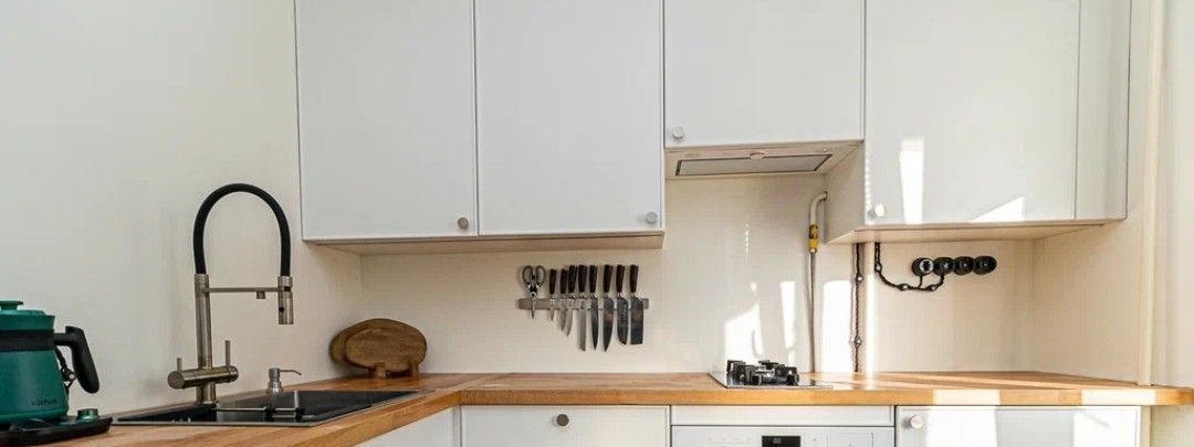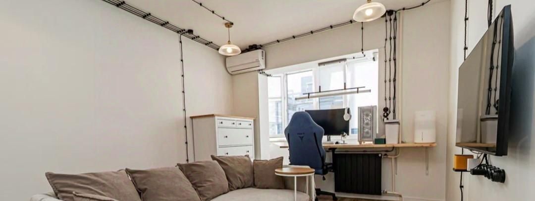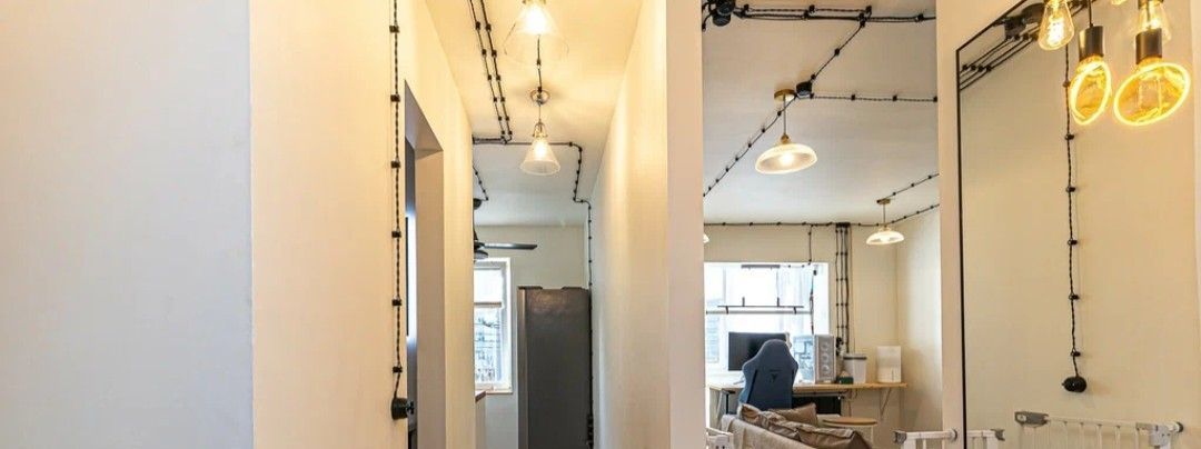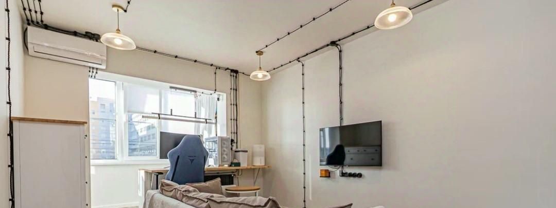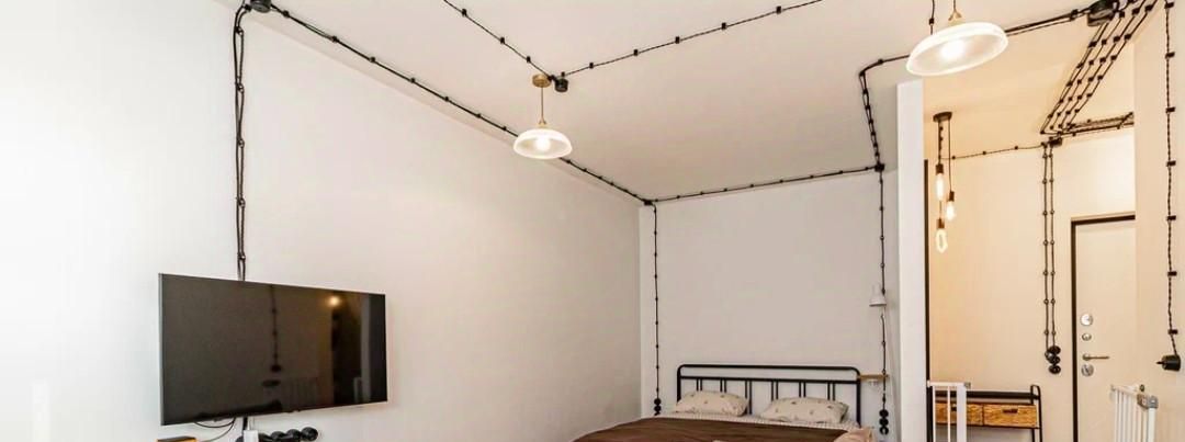 Квартира с характером — выполнен стильный ремонт в скандинавском стиле: белые стены, на полу кварц винил, элементы натурального дерева, атмосферная ретро-проводка с витым кабелем и чёрной фурнитурой.