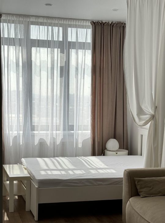 Тихая и светлая, кухня и отдельная комната с кроватью и раскладным диваном. Есть гардеробная и большой балкон с теплым полом и панорамным видом, в хорошую погоду из окна видно горы. Есть стиральная машина, две сплит системы, микроволновая печь, духовой шкаф, утюг, пылесос, гладильная доска, сушилка для белья, домашний интернет. Что немаловажно, тихие соседи и хорошие стеклопакеты, при закрытых окнах в квартире тишина. В шаговой доступности есть абсолютно все, во дворе есть салоны красоты, детский сад, продуктовый магазин. В подъезде консьерж, территория охраняемая. Можно с животными!