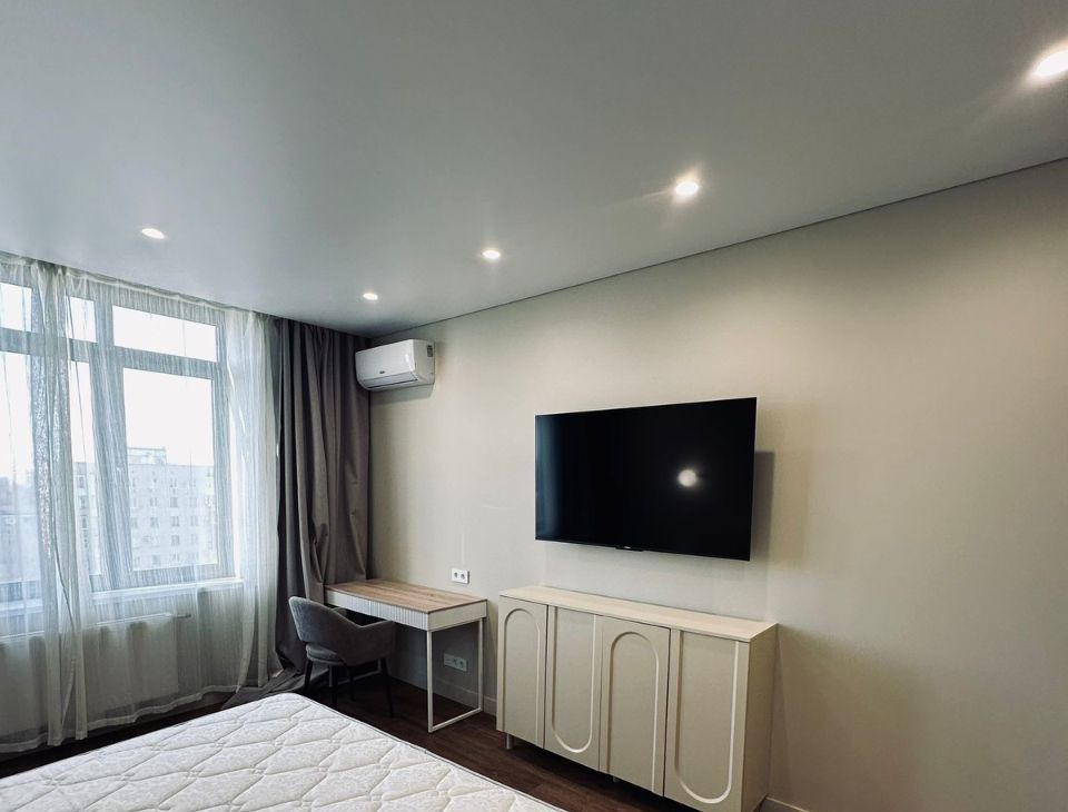 Квартира полностью готова для комфортного проживания. В ней есть современная мебель на кухне и в комнате, а также вся необходимая техника: кондиционер, холодильник, посудомоечная машина, телевизор и стиральная машина. Санузел совмещенный, оборудован душевой кабиной. Один балкон, где можно наслаждаться свежим воздухом и видом на город.