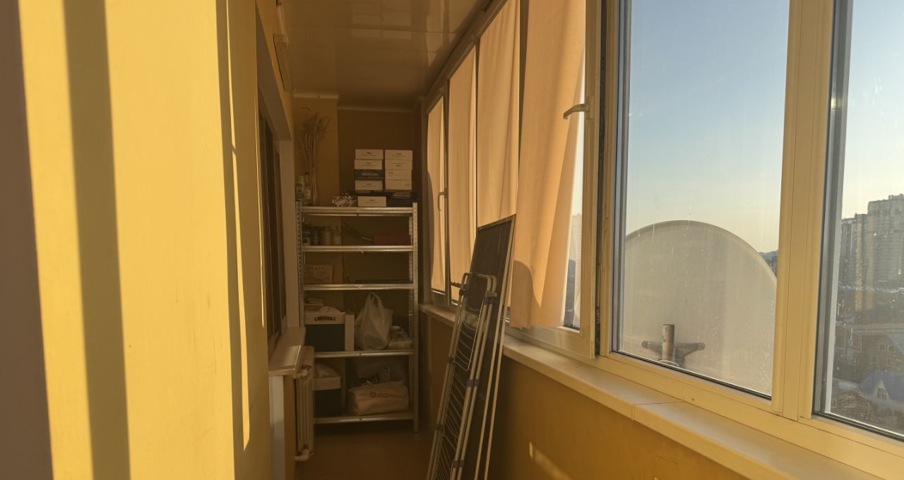 На балконе встроенная духовка, стиральная машинка, имеется также стеллаж для хранения вещей