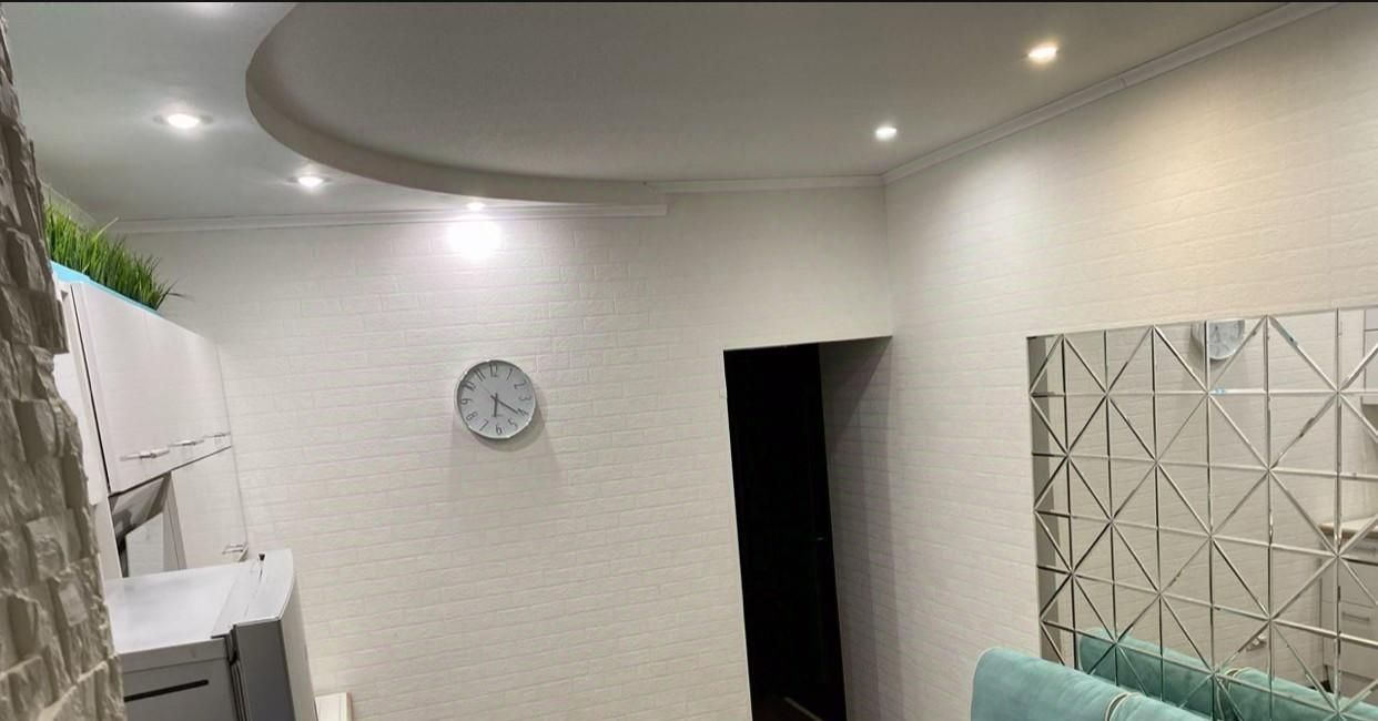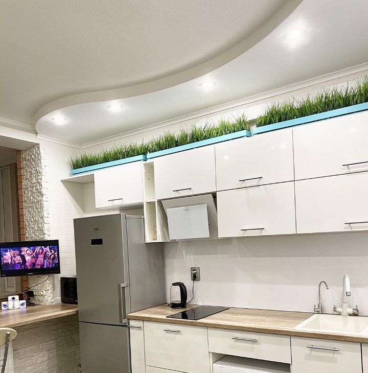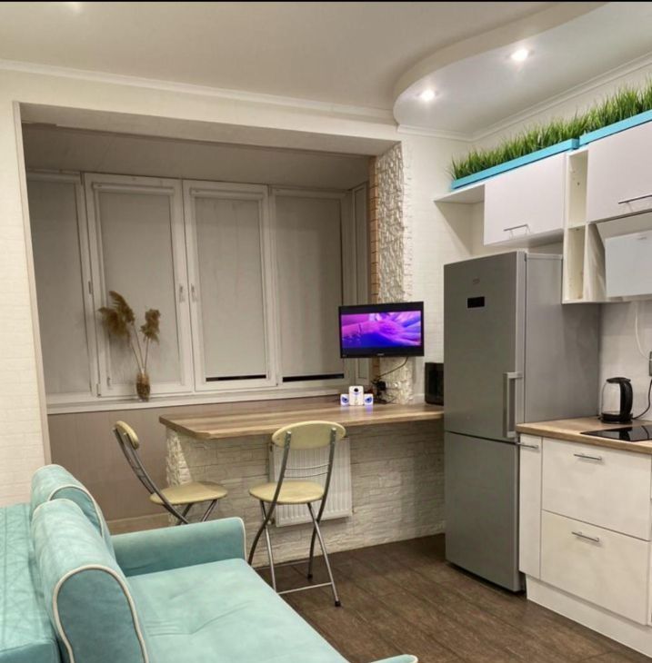 Кухня-гостиная с раскладным диваном, зеркальным панно и телевизором. Из техники имеется: индукционная варочная панель на две конфорки, холодильник, микроволновая печь, посудомоечная машина, увлажнитель. Установлен 5ти ступенчатый дорогой фильтр для чистой питьевой воды (можно пить деткам с рождения).