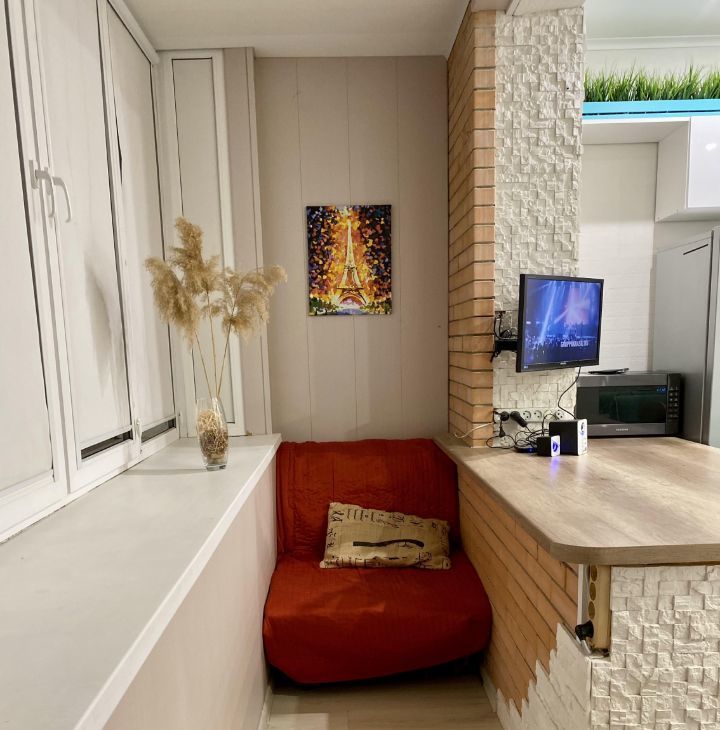 Лоджия на восемь оконных пролётов имеет выход на комнату и кухню, на балконе со стороны кухни стоит раскладное кресло-кровать, со стороны комнаты стеллаж для хранения.