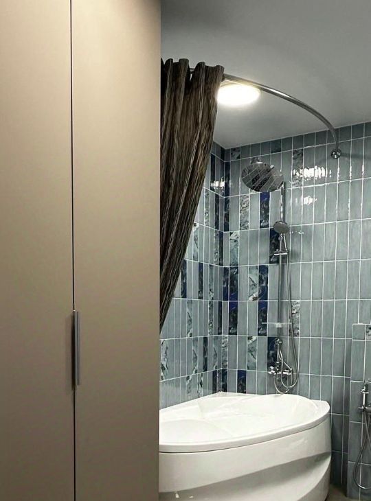 Большой санузел со встроенным шкафом для всех ванных принадлежностей и белья.