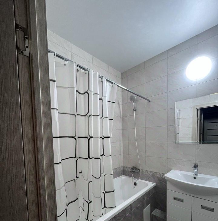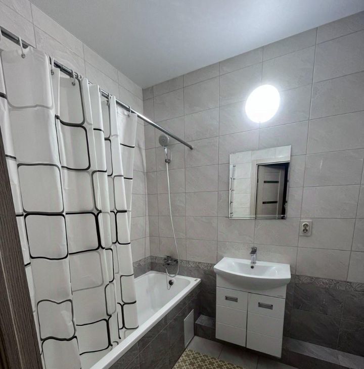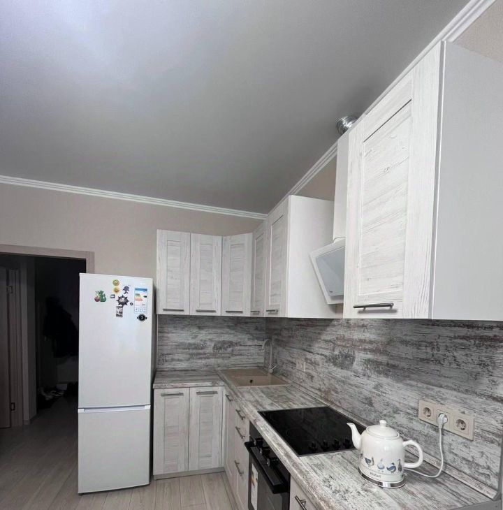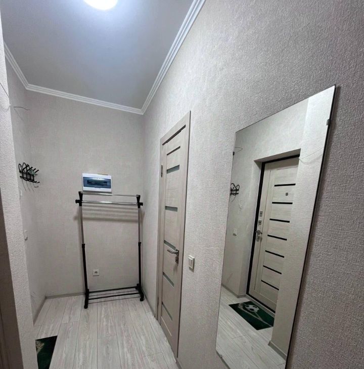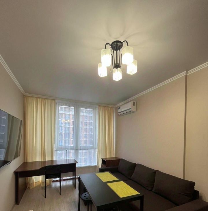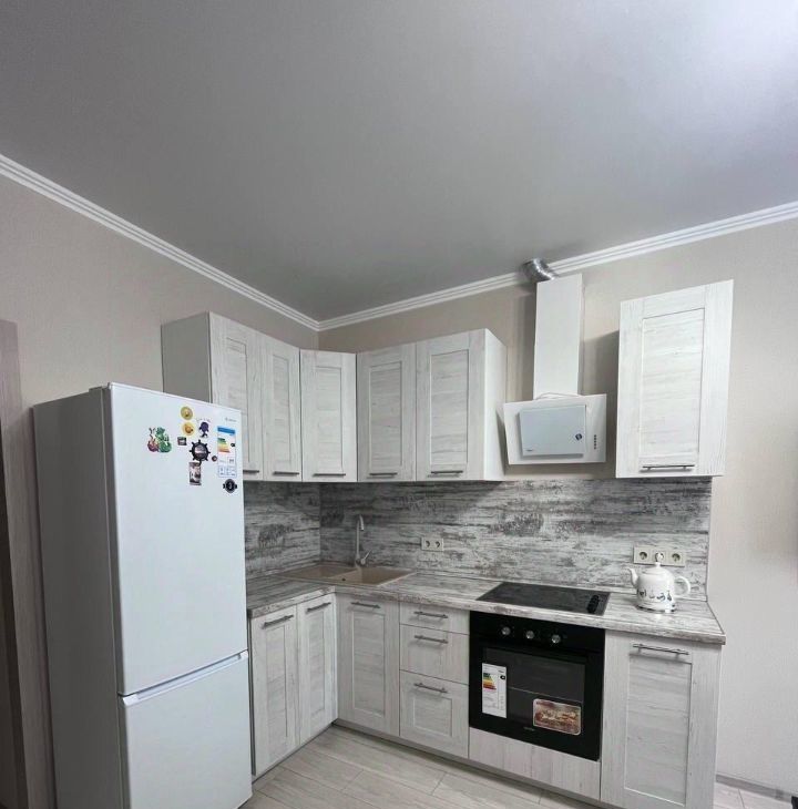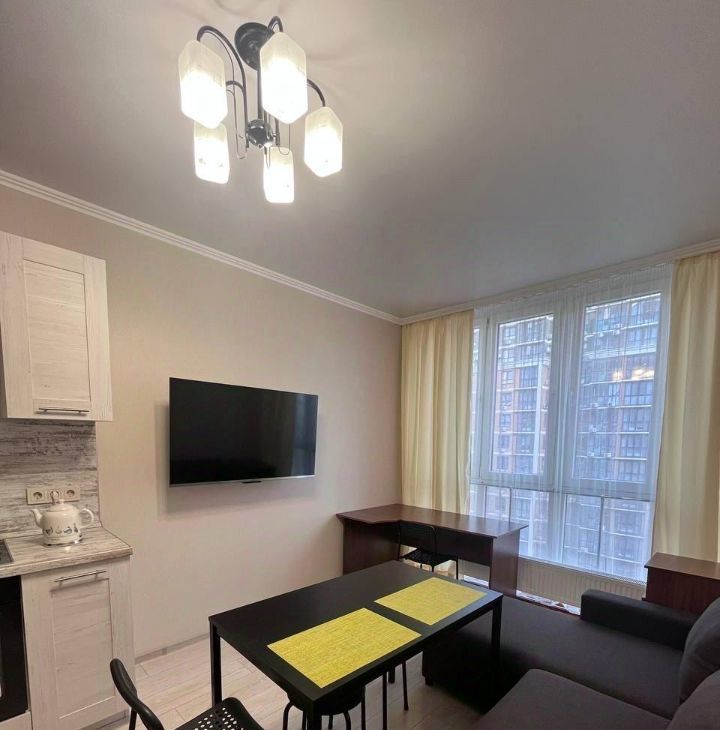Сдается однокомнатная квартира площадью 41 кв. м в современном доме 2020 года постройки. Квартира находится на 15-м этаже 24-этажного здания, окна выходят во двор. Кухня оборудована необходимой мебелью и техникой, включая холодильник, кондиционер и стиральную машину.