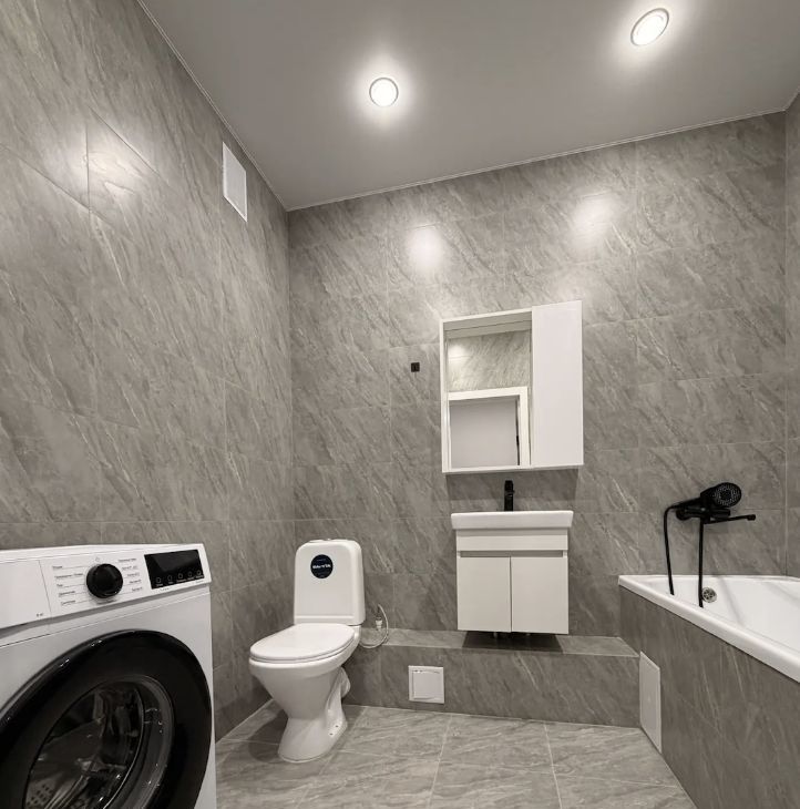 Санузел совмещённый, оборудован современной сантехникой и стиральной машиной.