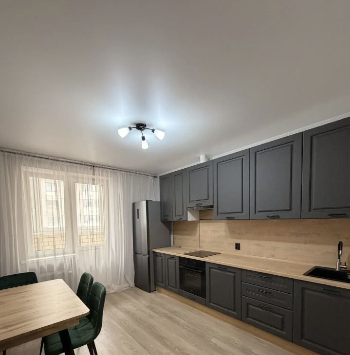 Просторная кухня площадью 14 м² оснащена всей необходимой техникой, включая холодильник и плиту.