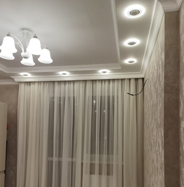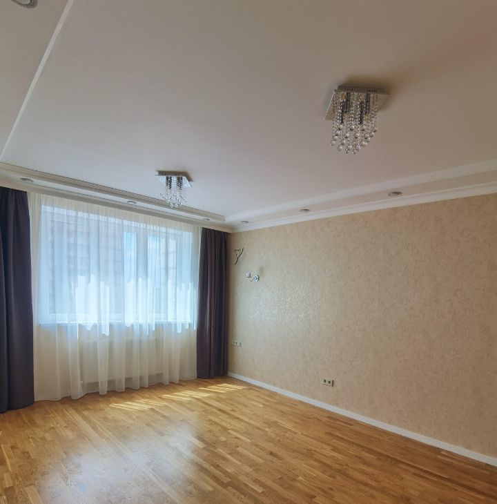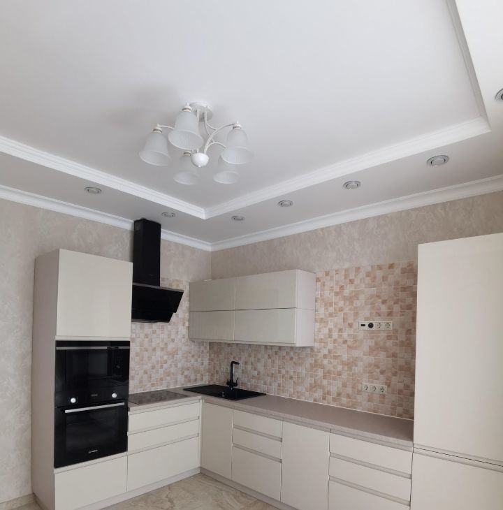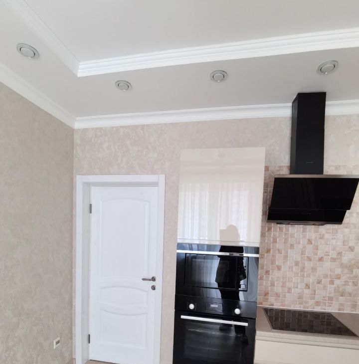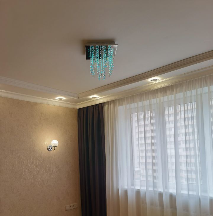 подвесные 2х - уровневые потолки (доп. от шума (не натяжные), люстры, точечники, разные световые зоны, диммеры, в санузле на всё стоят краники перекрытия, слив для бойлера, счётчики, датчики протечки, полноценная чугунная большая широкая ванна 170 на 80.