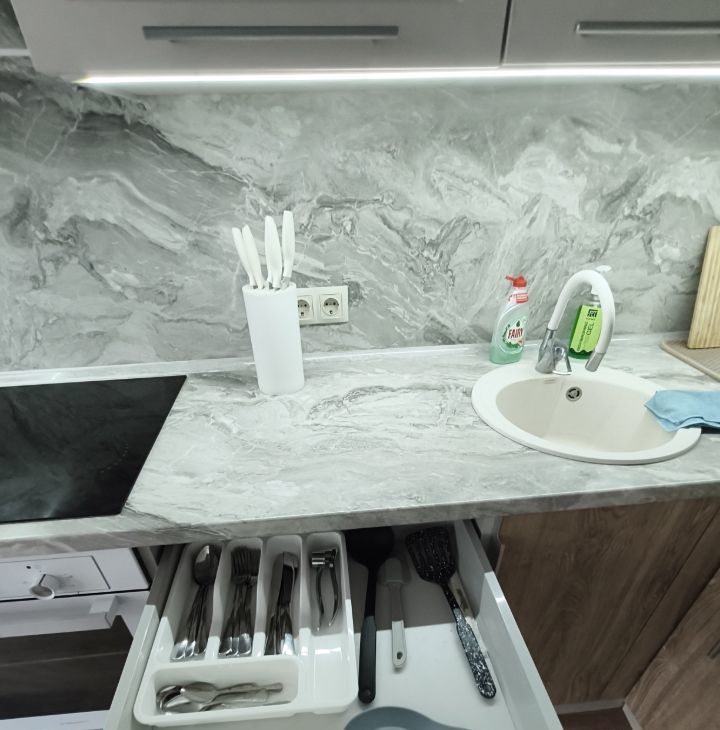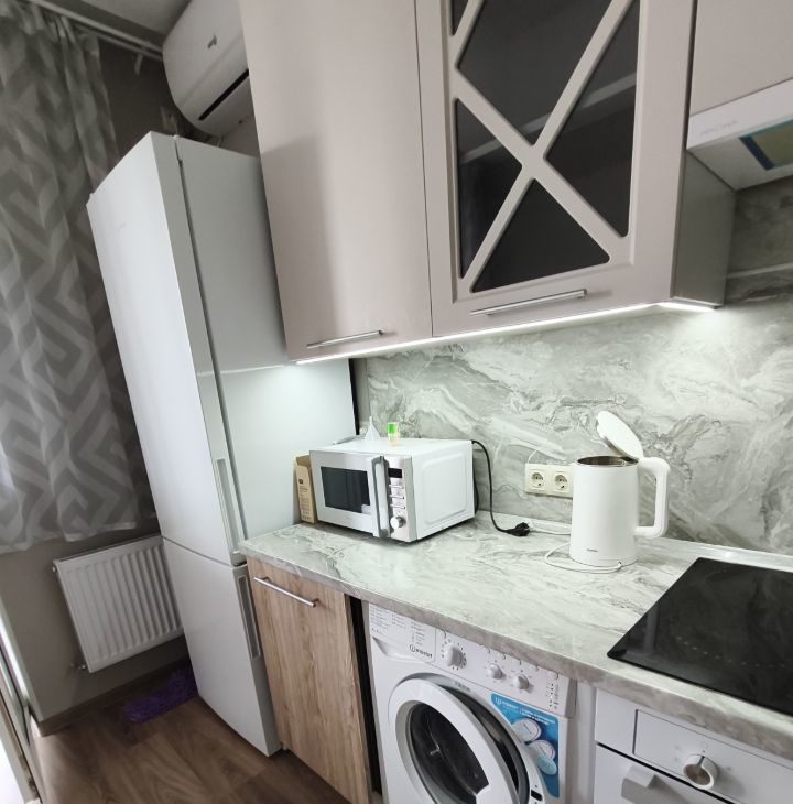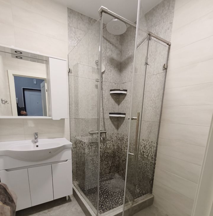 В квартире есть всё необходимое для комфортного проживания. Современная мебель гармонично сочетается с интерьером: обустроена как кухня, так и жилая комната. Ванная комната оборудована душевой кабиной. Из техники предоставлены кондиционер, холодильник, посудомоечная и стиральная машины, а также телевизор. Лоджия позволяет насладиться свежим воздухом, не выходя из дома.