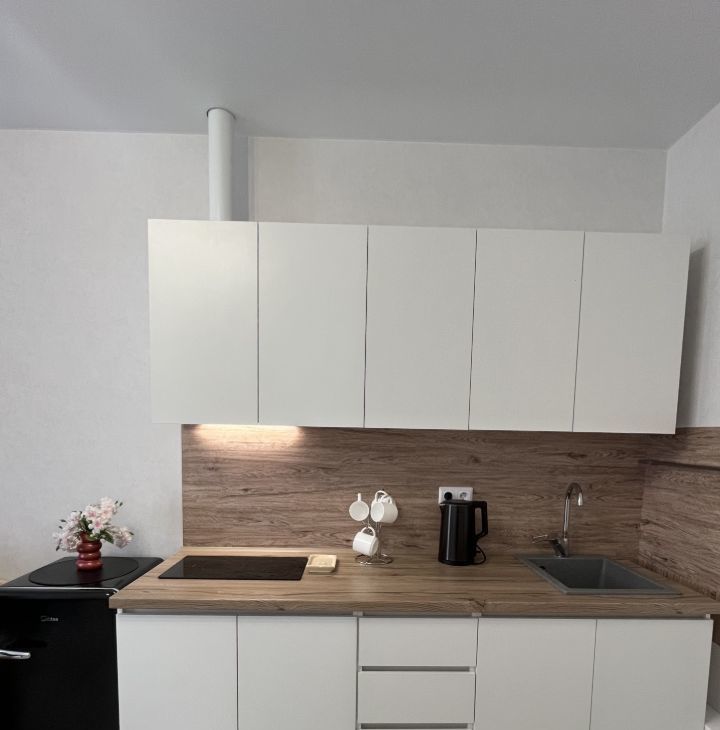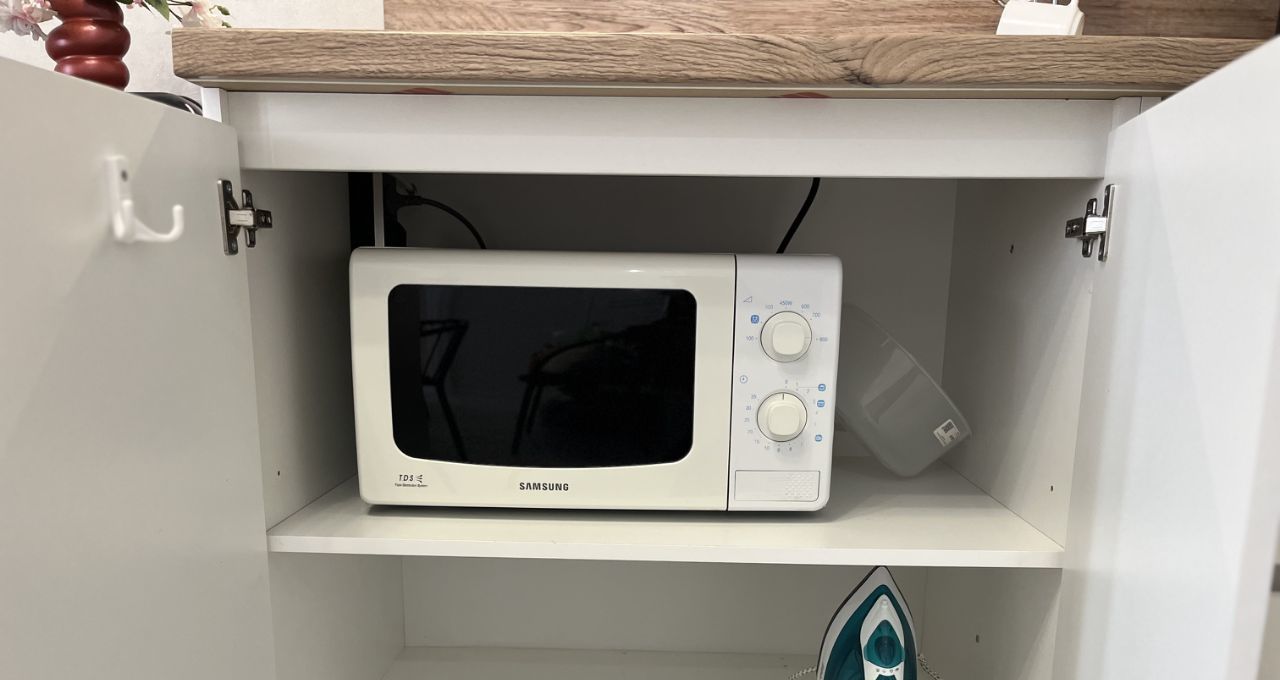 * Кухня: с полным оборудованием: электрический чайник, вытяжка, микроволновая печь, индукционная варочная панель и холодильник. Полный комплект посуды, включающий индукционные сковороду и кастрюли.