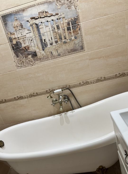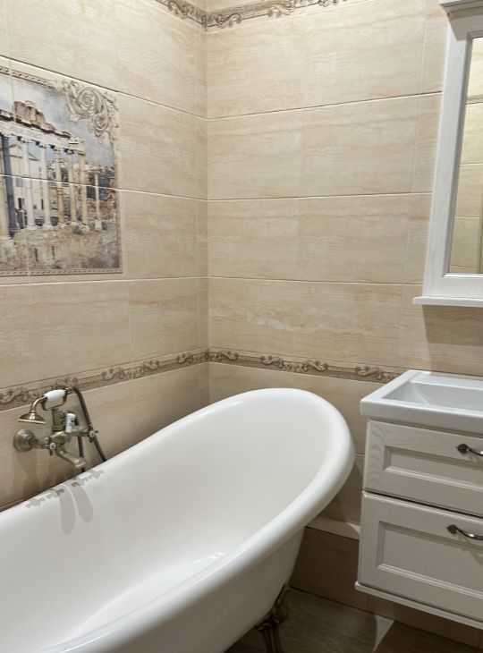 Тёплый пол в кухне, прихожей и у кровати. Испанская плитка, ванна на лапах, элитная сантехника — стильно и надёжно.