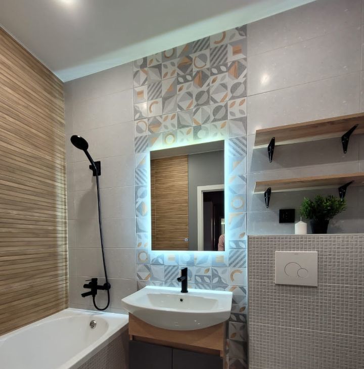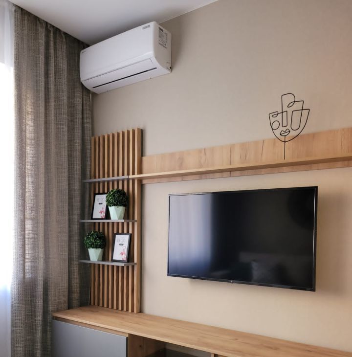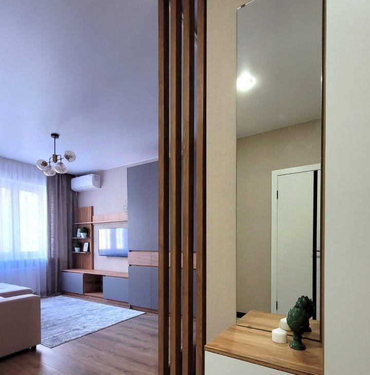 Квартира имеет дизайнерский ремонт, что создаёт стильную и комфортную атмосферу. В комнате и на кухне есть вся необходимая мебель. Кухня оборудована современной техникой: кондиционер, холодильник, телевизор и стиральная машина. В совмещённом санузле установлена ванна, где можно расслабиться после рабочего дня.