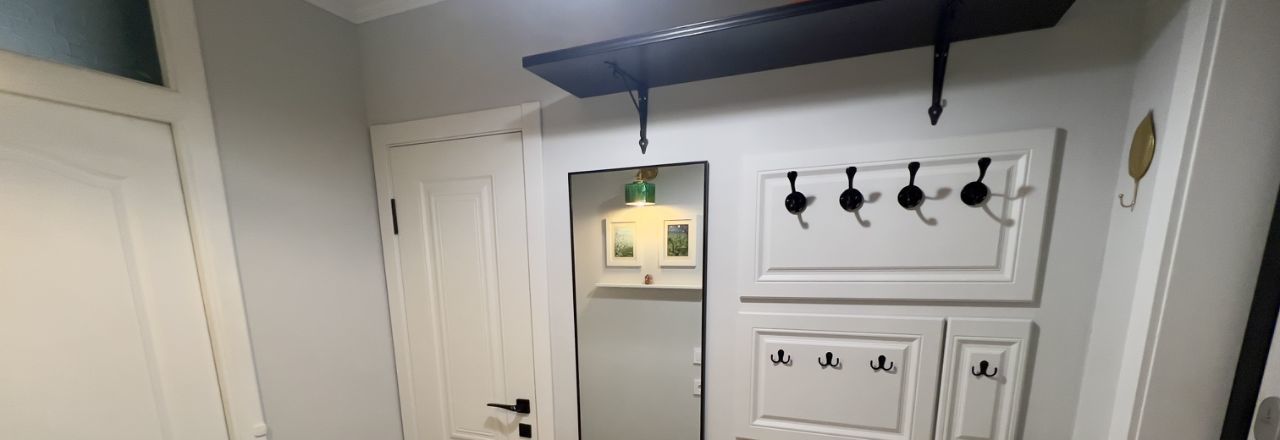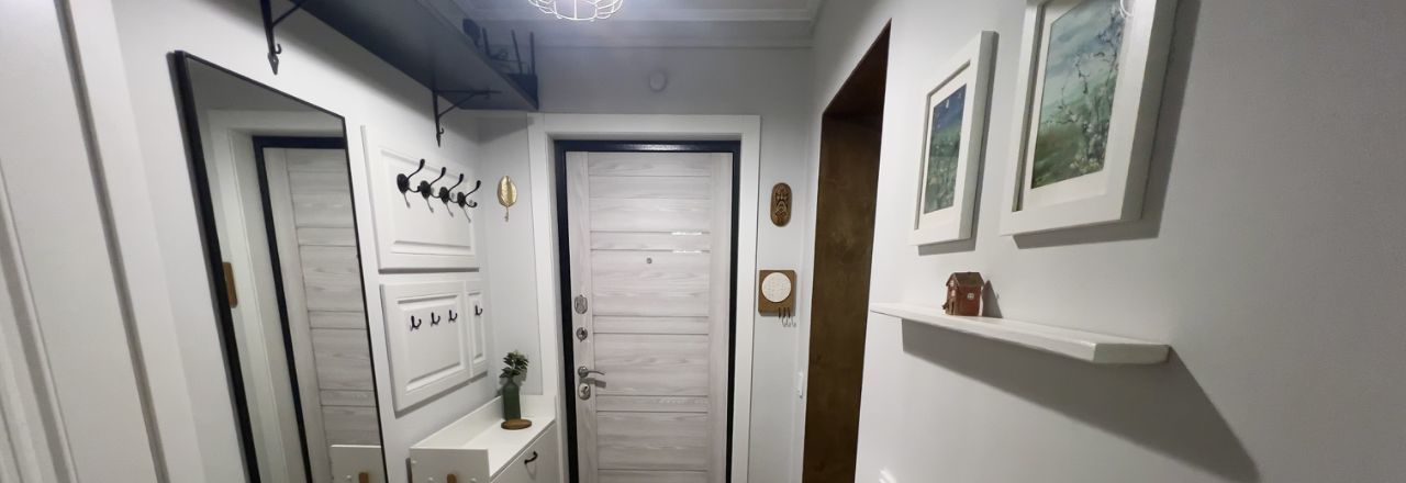 Квартира с продуманным современным ремонтом, спокойным светлым интерьером и большим количеством мест для хранения.