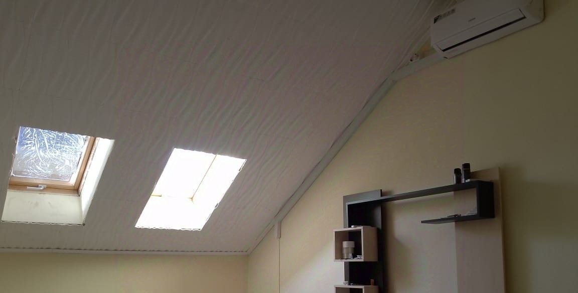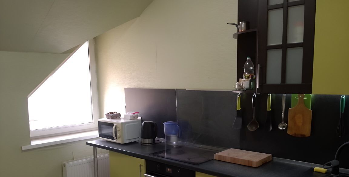 Однокомнатная квартира на мансардным этаже, потолки 3 м, поэтому скос стены не сильно ощущается. Четвертый этаж без лифта. Есть вся необходимая техника: варочная панель электрическая, духовка, холодильник, микроволновка, чайник, стиральная машина, кондиционер.
