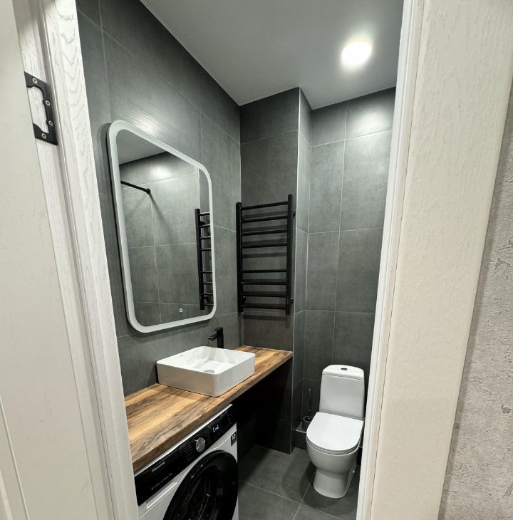 Имеется вся необходимая мебель и техника для проживания (кровать с матросом, шкафы, телевизор, стиральная машина, духовой шкаф, холодильник, вытяжка, электрический полотенцесушитель, стол, стулья, электрическая варочная панель, сплит-система, пылесос.