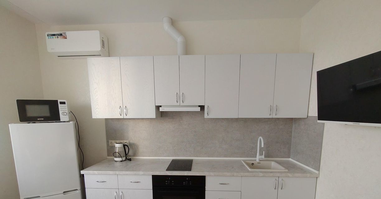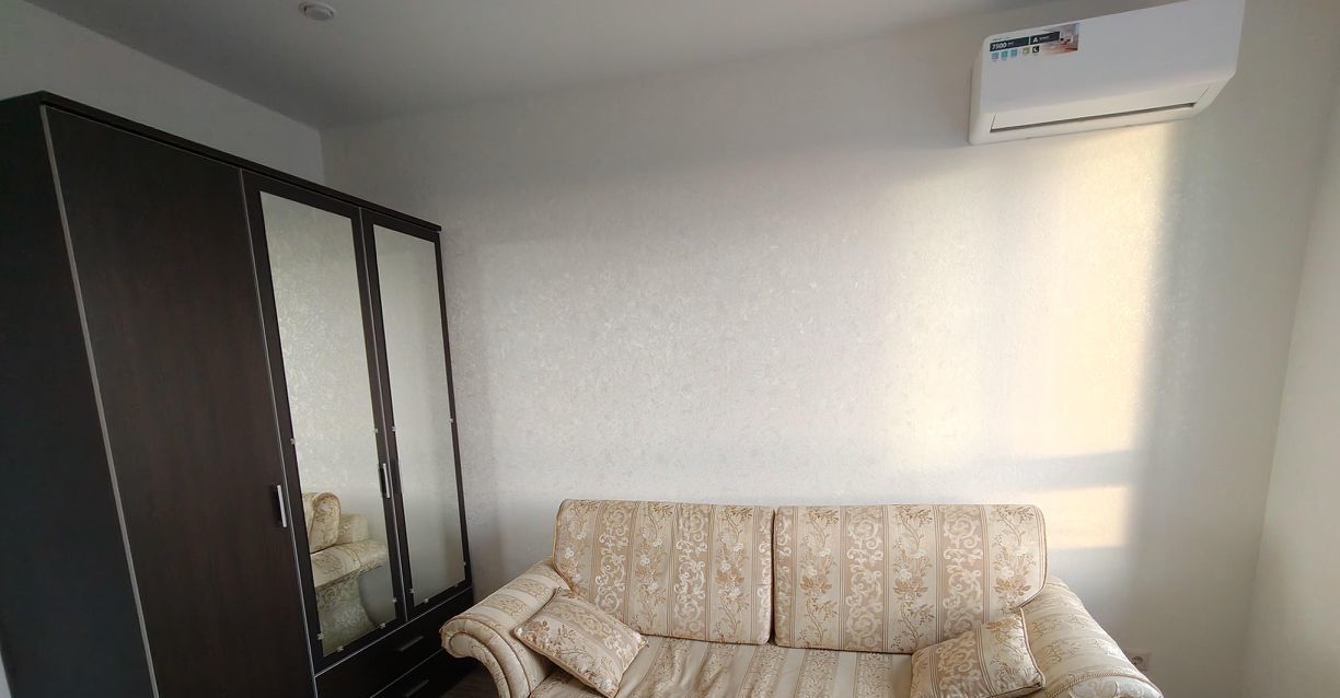 В квартире сделан качественный евроремонт. Здесь есть всё необходимое для комфортного проживания: современная мебель на кухне и в комнате, а также вся необходимая техника — кондиционер, холодильник, телевизор и стиральная машина. Санузел совмещённый, с ванной. Также имеется балкон, где можно наслаждаться свежим воздухом.