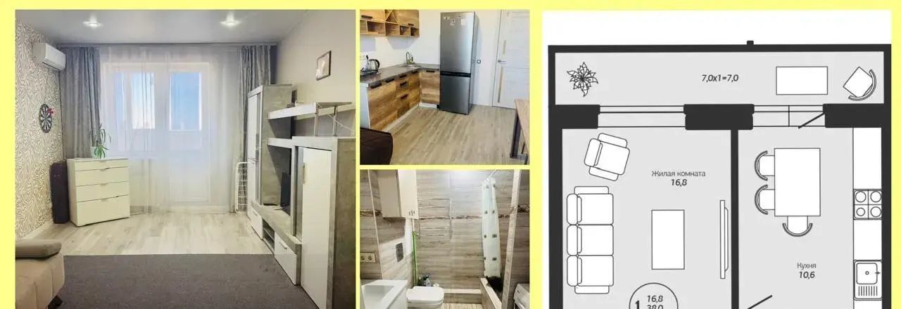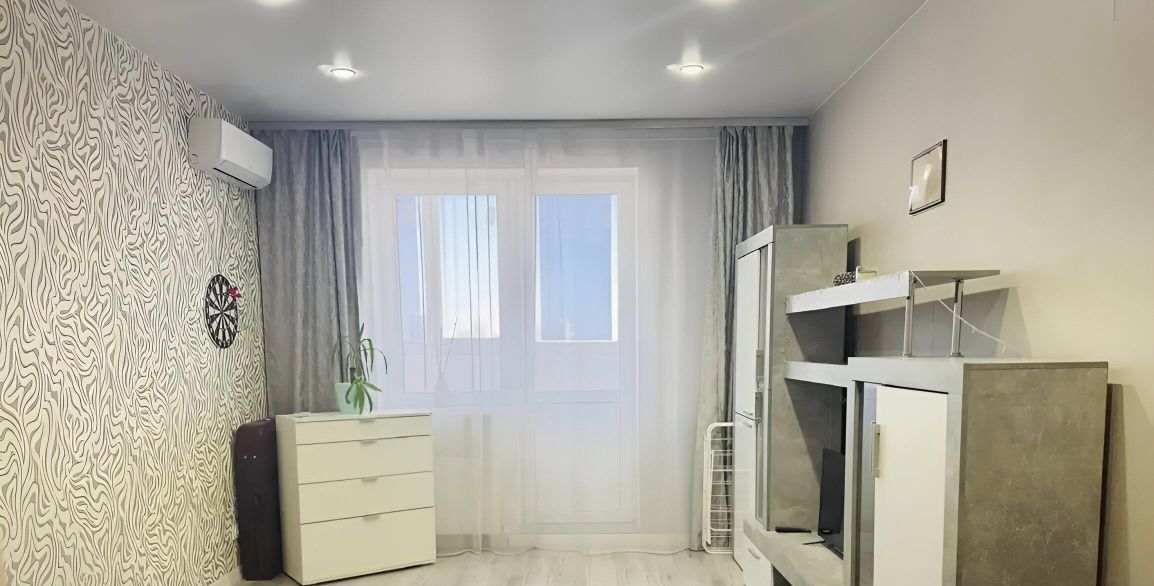 В квартире выполнен косметический ремонт, установлена необходимая мебель как в комнате, так и на кухне. Для вашего комфорта есть кондиционер и холодильник. Санузел совмещённый, оборудован душевой кабиной. Есть лоджия, окна выходят на улицу, что обеспечивает хорошее естественное освещение.