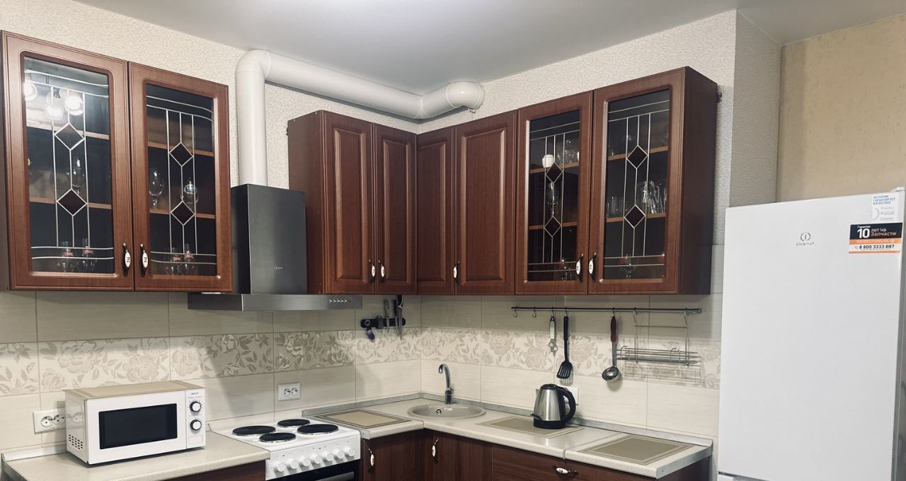Укомплектованная техникой и посудой кухонная зона.