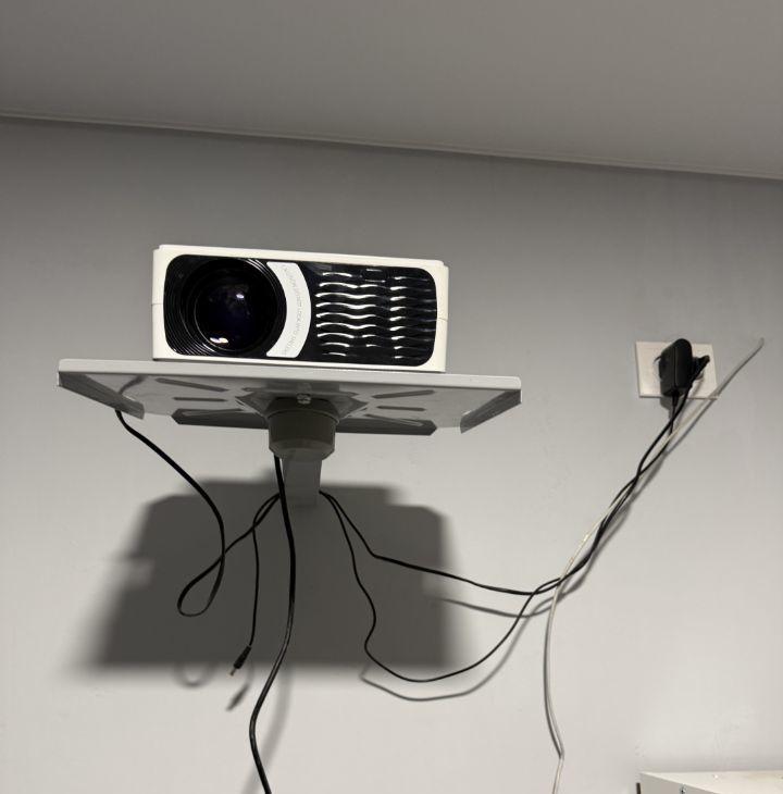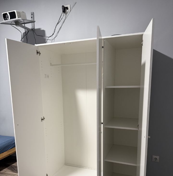 Имеется холодильник, плита, духовой шкаф, чайник, стиралка, тв-проектор в комнате для просмотра фильмов, кровать, шкаф, диван на кухне не раскладывается, в общем все как на фото