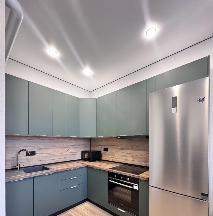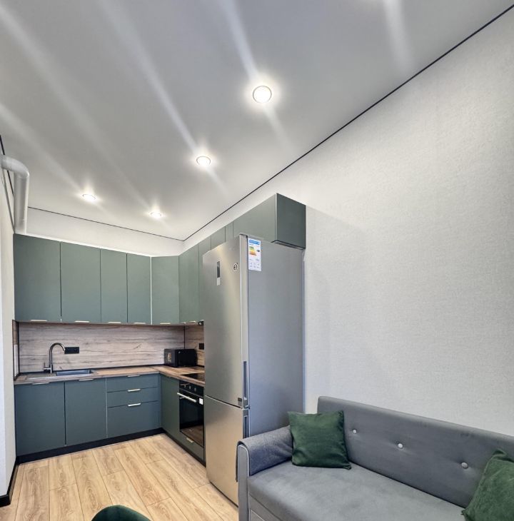 Кухня просторная, площадью 15 м², оснащена всей необходимой техникой: холодильник, плита, микроволновая печь, духовой шкаф. Есть посуда. На кухне установлен кондиционер и телевизор с кабельным/цифровым ТВ. Из мебели — шкафы и удобный диван.