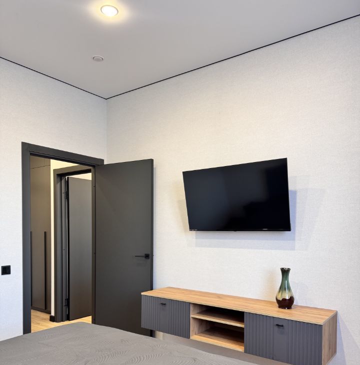 В спальне телевизор, большая кровать.