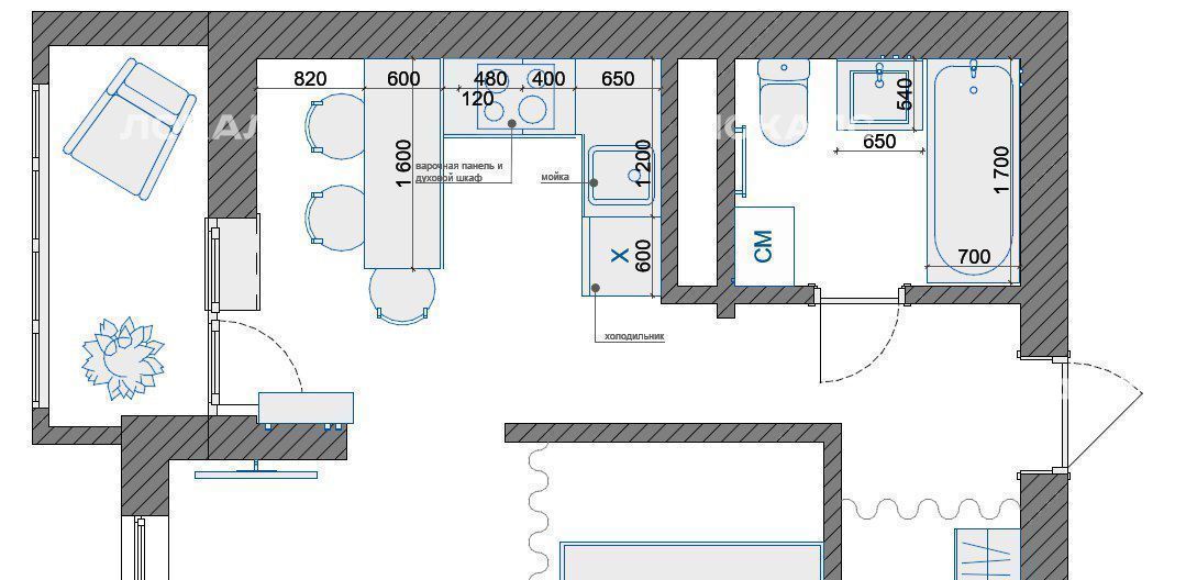 Сделана чистовая отделка всей квартиры и санузел. Кухни нет.