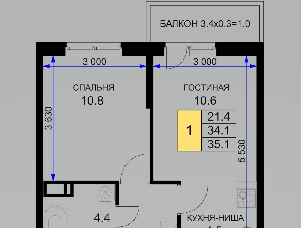 Квартира хоть и однокомнатная, но по факту это как двушка, где гостиная совмещена с кухней.