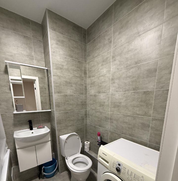 В квартире выполнен косметический ремонт. Просторная комната оборудована необходимой мебелью: вместительным шкафом, кроватью. Из техники имеется холодильник и стиральная машина, микроволновая печь, электрический чайник.Санузел совмещенный, оформлен современной плиткой, оснащён ванной и стиральной машиной.