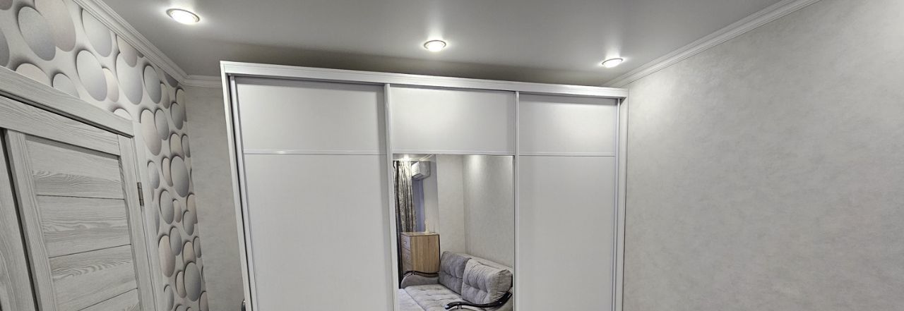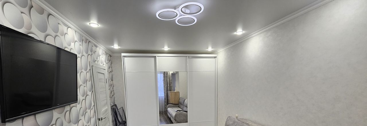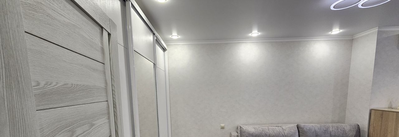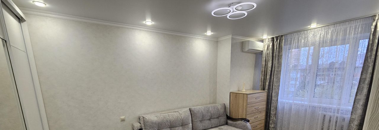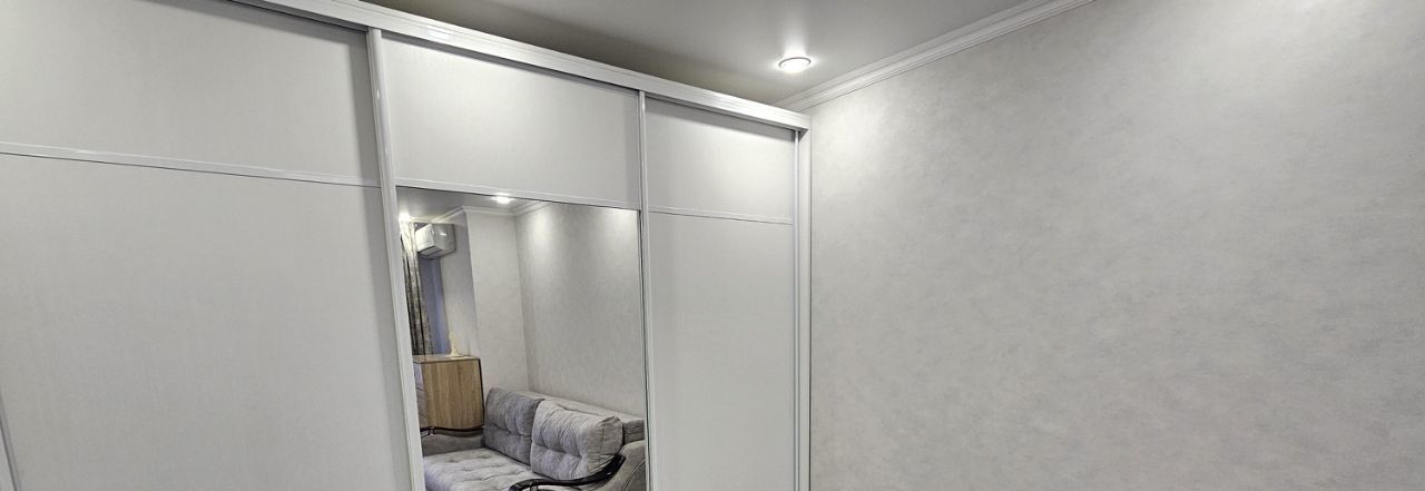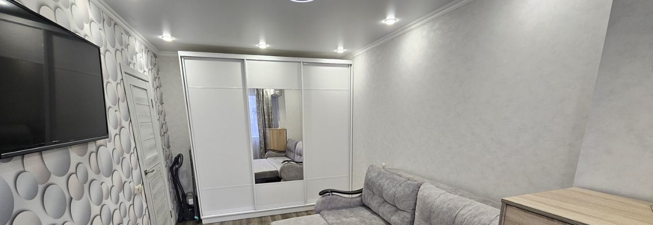 Квартира с современным евро ремонтом светлая и просторная. В комнате установлен кондиционер, имеется телевизоришкафы для хранения вещей. Из мебели — удобный диван вместительный шкаф и комод