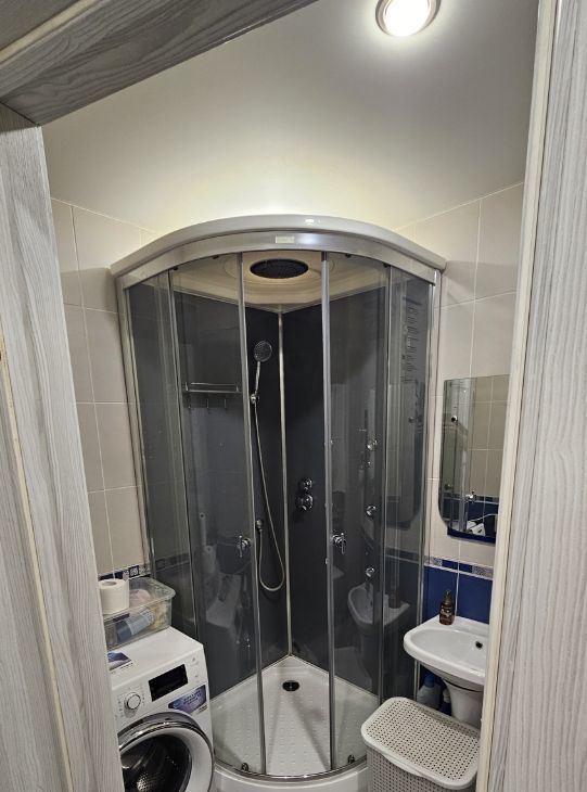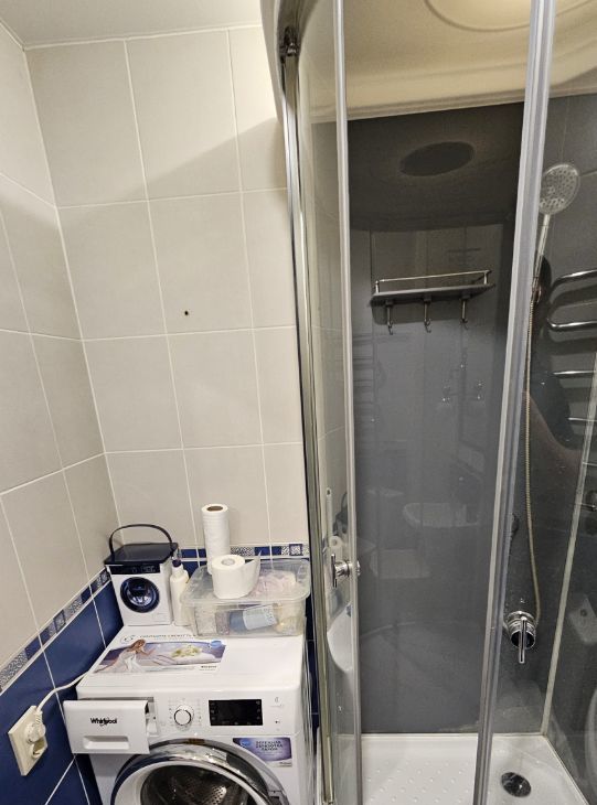 Санузел совмещенный, выполнен в современном стиле с душевойкабиной установлена стиральная машина