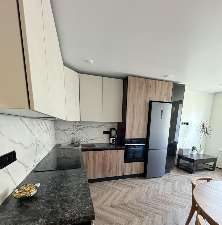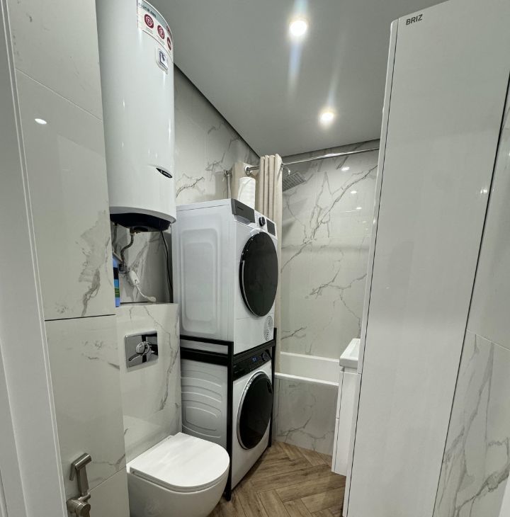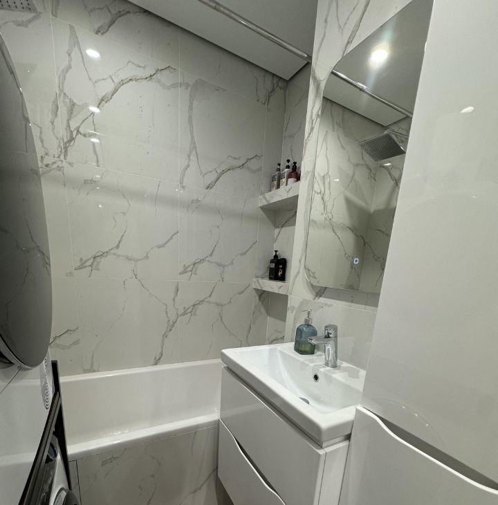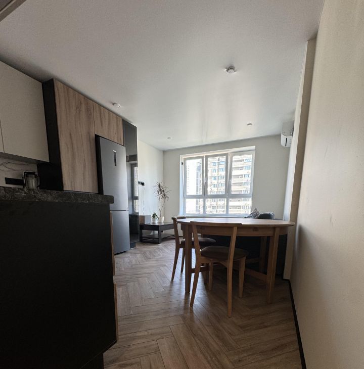 Квартира со свежим ремонтом, полностью готова для комфортного проживания. Кухня площадью 19 кв. м. оборудована современной техникой: плита электрическая, духовой шкаф, микроволновка, кондиционерами в каждой комнате, холодильником, посудомоечной, и сушильной и стиральной машинами. Санузел совмещенный, в нем установлена ванна, теплая стена.