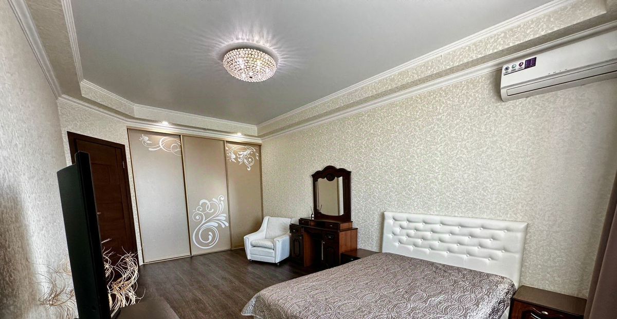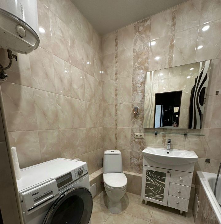 В квартире сделан качественный евроремонт. Обстановка включает всю необходимую мебель как в комнате, так и на кухне. Из техники есть кондиционер, холодильник, телевизор и стиральная машина. В санузле установлена ванна.