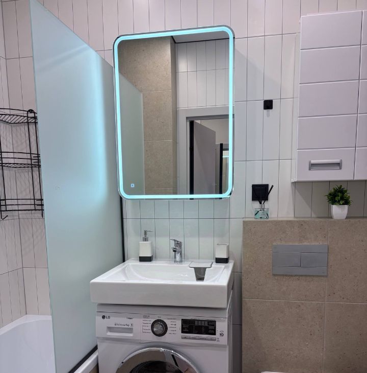 • Продуманная система хранения в ванной: зеркало с полочками и подсветкой, тумба с раковиной.