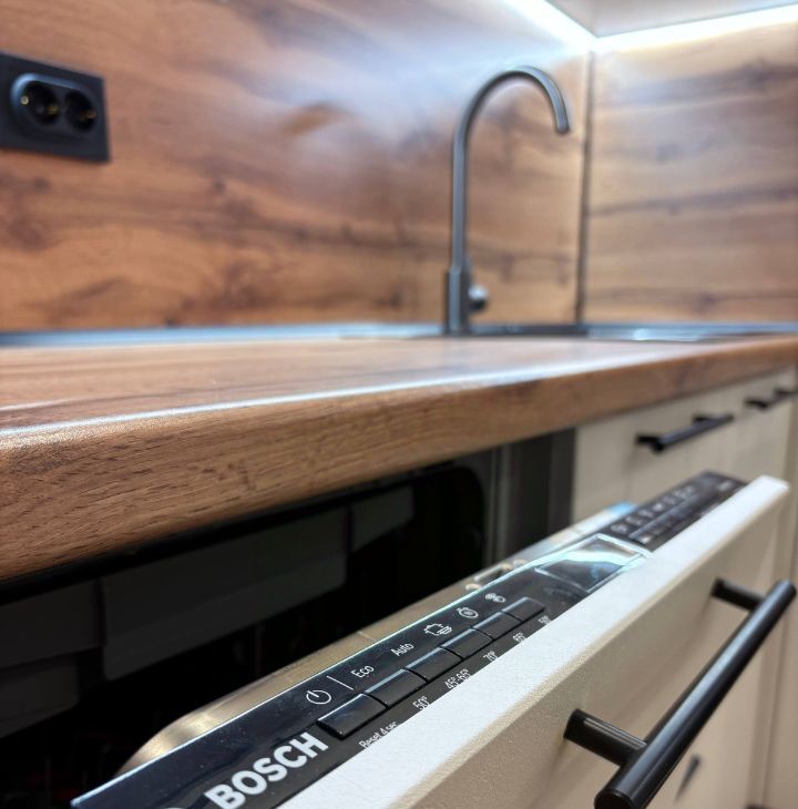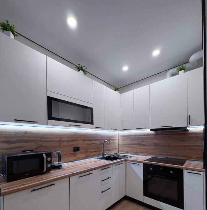 • Вся новая встроенная техника: посудомоечная машина Bosch, духовой шкаф, варочная панель, новый холодильник, микроволновка, чайник;