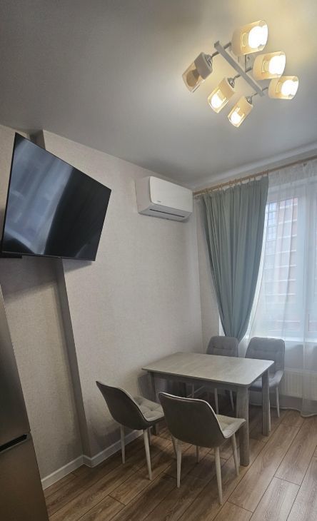 В квартире выполнен евроремонт, что делает её ещё более привлекательной. Просторная комната и обустроенная кухня оснащены всей необходимой мебелью. Из техники в вашем распоряжении: кондиционер, холодильник, телевизор и стиральная машина. Совмещённый санузел оборудован ванной. Окна выходят во двор, что обеспечивает тишину и уют.