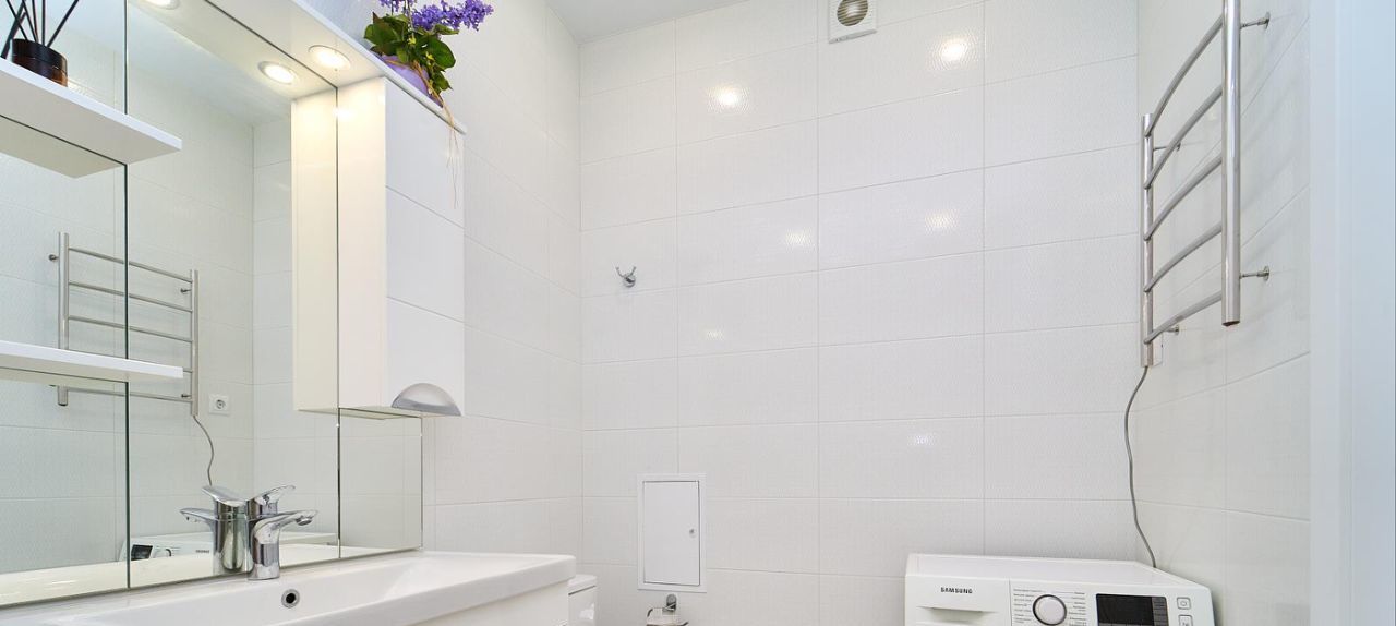 Современная сантехника: Совмещенный санузел с новой сантехникой и стиральной машиной.