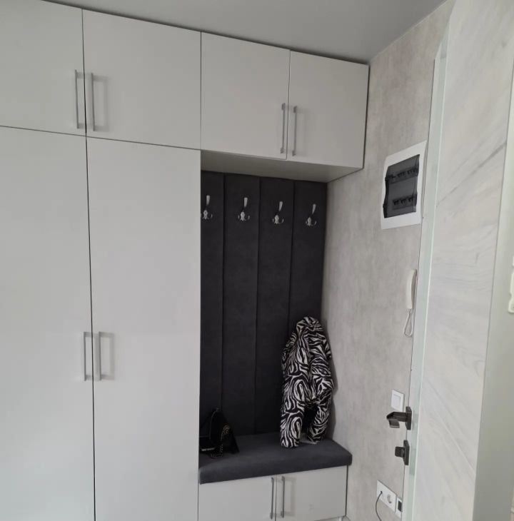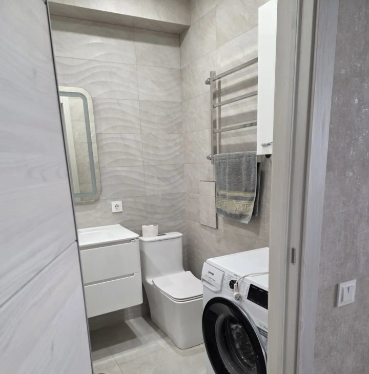 В квартире есть кондиционер,гардеробная,кухня укомплектована всей необходимой техникой,включая холодильник и микроволновую печь.В квартире имеются тёплые полы,балкон застеклён и на нём есть вместительный шкаф.Сан узел совмещён и дополнительно установлен нагреватель воды на случай отключения горячей воды в летнее время.