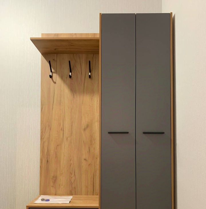В квартире из мебели и техники имеется: прихожая, кровать двуспальная, шкаф в комнате, диван в кухне, холодильник, стол, стулья, кухня, плита, тумба в ванной.