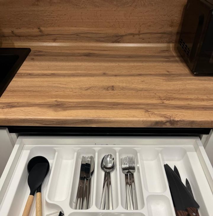 Белая встроенная кухня. Техника. Посуда.