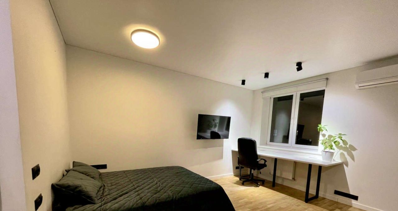 Вместительная гардеробная, кухонный гарнитур со встроенной техникой, двуспальная кровать , рабочий большой стол.