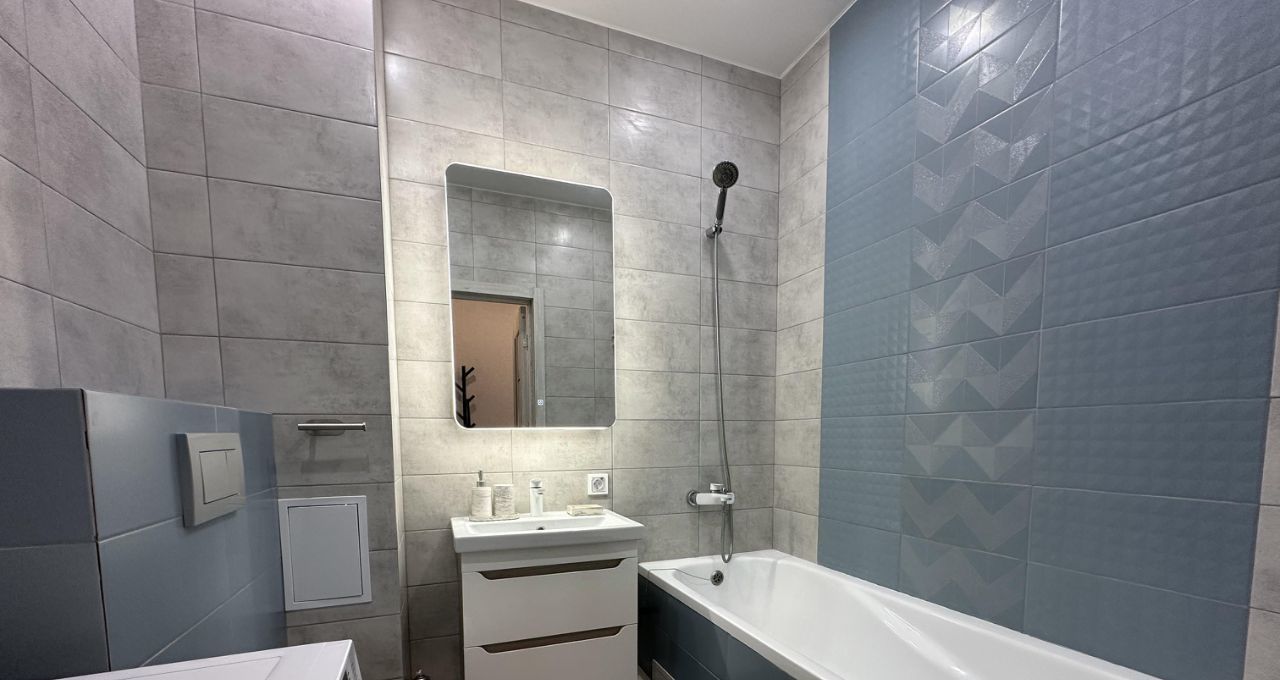 Квартира полностью готова для комфортного проживания. В комнате и на кухне есть вся необходимая мебель. В кухне удобно готовить, а в комнате — расслабиться после рабочего дня. В квартире установлены кондиционер, холодильник, телевизор и стиральная машина, что делает ваше пребывание здесь максимально комфортным. Ванная комната оборудована современной сантехникой, есть ванна для приятного отдыха.