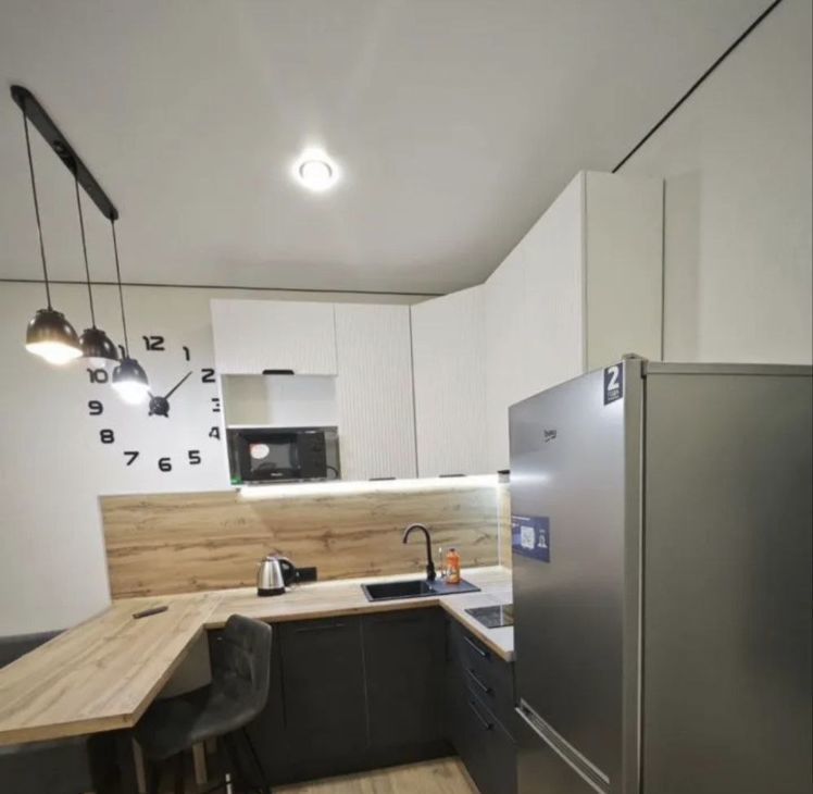 • Уютная кухня в стиле Лофт с новой техникой. Варочная поверхность с вытяжками, фильтр проточной воды, холодильник, микроволновая печь, телевизор диагональ 109 см, Led подсветка, диван, стиральная машина. Полный набор новой посуды и столовых приборов.
