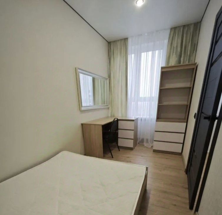 • Светлая комната с большим окном. Двухспальная кровать 140 на 200 см, большое зеркало, рабочее место, шкаф для белья, тумбочка.