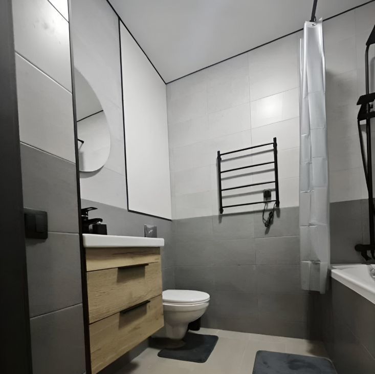 • Санузел: совмещённый в современном стиле, с подсветкой зеркала, инсталляцией, акриловая ванная 180 на 80. Сантехника чёрного цвета. Так же установлены автоматические датчики протечки.