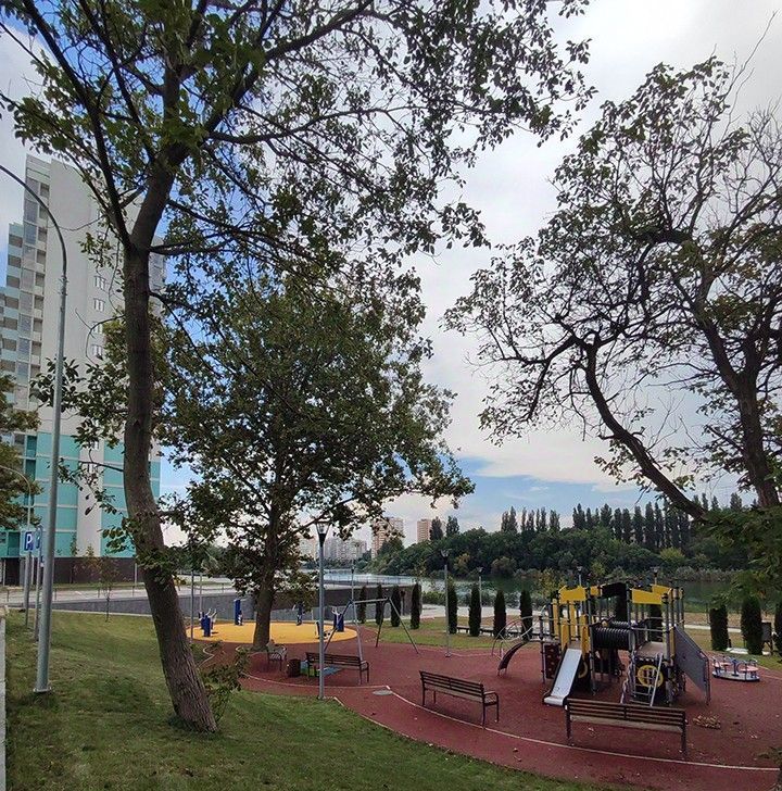 Удобное расположение рядом красивое озеро, парковка, магазины, школы, универы, спортплощадки, всё в шаговой доступности.