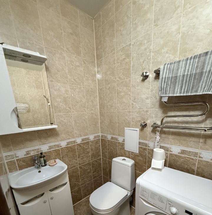 Просторная 1-комнатная квартира (42 кв. м). В квартире есть ВСЁ для комфортного проживания: необходимая мебель (кухонный гарнитур, шкаф, диван, кровать с удобным матрасом), вся бытовая техника (холодильник, стиральная машина, плита, духовка, ТВ и пр.). Заезжай и живи!