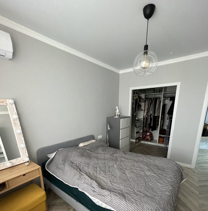 В квартире установлены шкафы, а также имеется гардеробная и кладовая для удобного хранения вещей. Совмещённый санузел оборудован современной сантехникой и стиральной машиной.