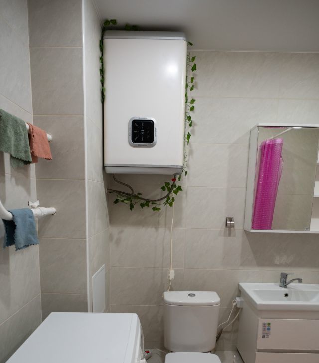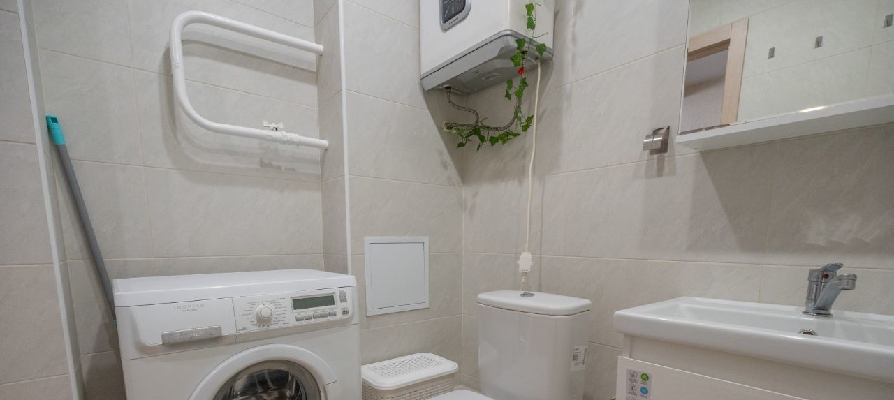 • всё необходимое для жизни (двухспальная кровать, раскладывающийся диван на кухне, стол, стиральная машинка, бойлер, микроволновая печь, кондиционер, просторный шкаф-гардеробная);
