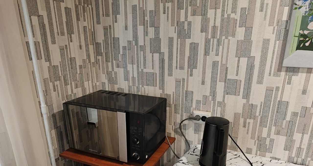 В комнате установлен кондиционер, имеется телевизор и шкафы для хранения вещей, а также есть удобный диван. На кухне обеденный стол со стульями, установлена современная газовая плита. Есть микроволновка , чайник, холодильник. Есть при необходимости вся необходимая посуда.