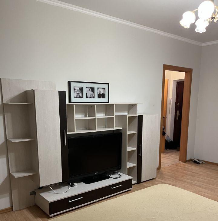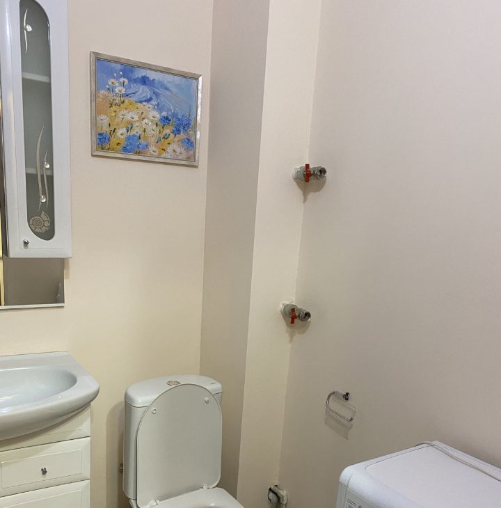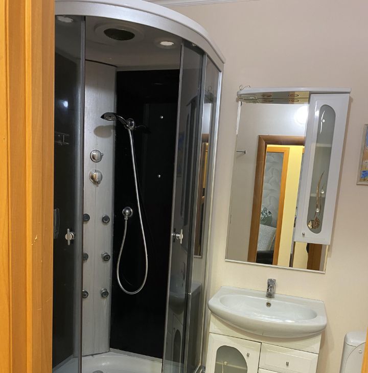 Квартира обставлена современной мебелью в комнате, и на кухне, что позволяет сразу заехать и жить. На кухне есть вся необходимая техника: холодильник, стиральная машина, кондиционер и телевизор. Санузел совмещенный, оборудован душевой кабиной.