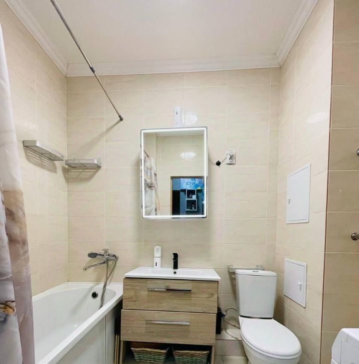 В квартире сделан косметический ремонт, который придает помещению свежий и чистый вид. В вашем распоряжении вся необходимая мебель как в комнате, так и на кухне. Из техники есть кондиционер, холодильник, телевизор и стиральная машина — все, что нужно для комфортного проживания. Санузел совмещенный, оборудован удобной ванной.